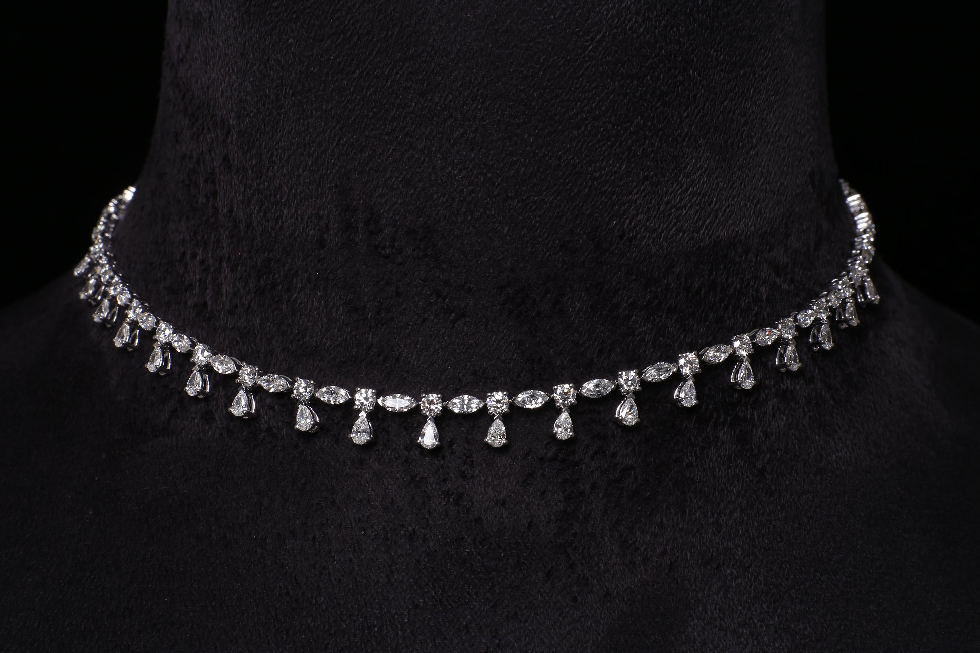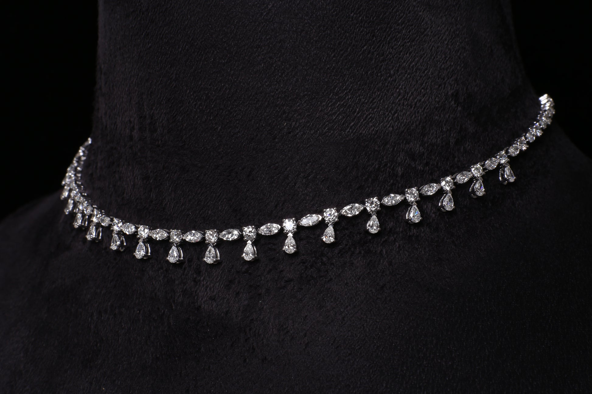 A necklace like a sparkling shower of stars: Small, pear-shaped diamonds hang elegantly along the neck, reflecting the light with every movement. A piece full of dynamism and glamour, perfectly complementing festive outfits.